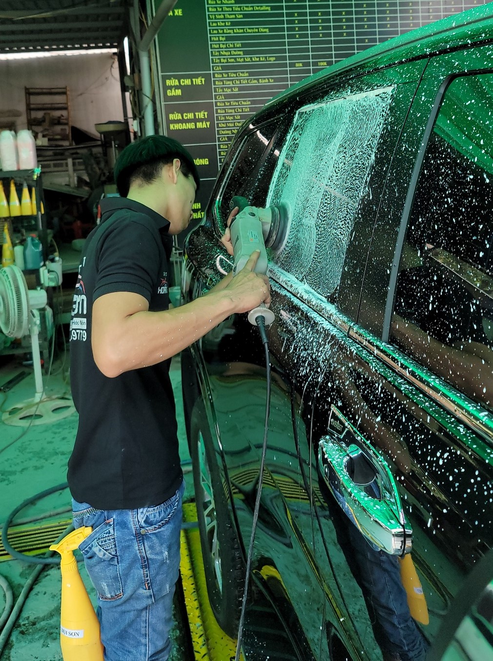 - Rửa và lau chi tiết – Không giống như rửa xe, các detailing được thực hiện bằng tay. Bước đầu tiên là xịt rửa xe bằng bình xịt chuyên dụng có công suất lớn, tiếp theo là rửa kỹ vành xe, khe cửa, kính và tất cả các bộ phận bên ngoài cần làm sạch.